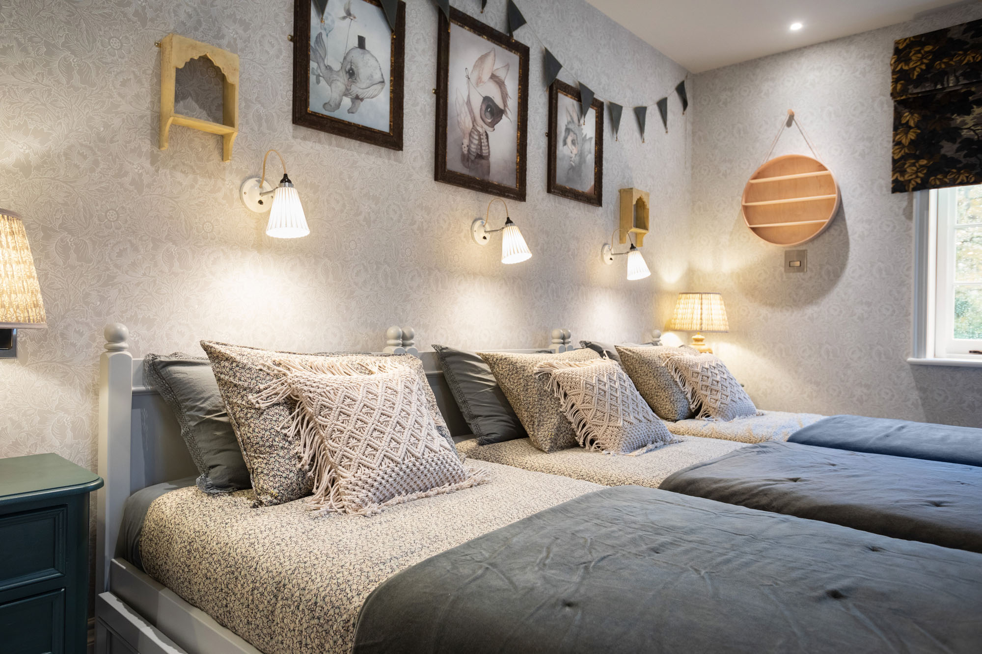 Set within a picturesque British countryside estate, this enchanting bedroom was designed as a complete contrast to the children's sleek, modern life in Dubai. Inspired by the timeless charm of a classic Victorian nursery, the space features Morris & Co wallpaper and patterned rugs that add authentic period detail. Three dove grey single beds are arranged side by side, each with its own reading light and vintage trunks for storing treasures, creating a cosy, harmonious retreat for young children. The room flows effortlessly into a dedicated play space, complete with hidden play area, vintage toy cupboards, bookcases and bespoke storage. A mezzanine level TV lounge offers a snug hideaway for watching films together. Thoughtfully layered with deep green accents, antique furnishings, fairy lights and whimsical artwork, this nursery combines heritage style with imaginative, child-friendly design while providing all the comforts of modern family life.