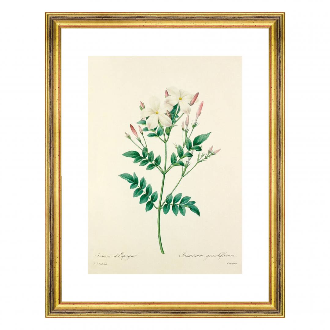 Our Jasmin d'Espagne Art Print is taken from a set of vintage botanical lithographs. This beautiful hand coloured print features a specimen Jasmin d'Espagne (Jasminum grandiflorum) and buds on a buff background with illustrator's notes and genus details. Delicately faded, this exquisite print is part of a collection of floral artworks and grouping them will create a beautifully decorative wall art display.